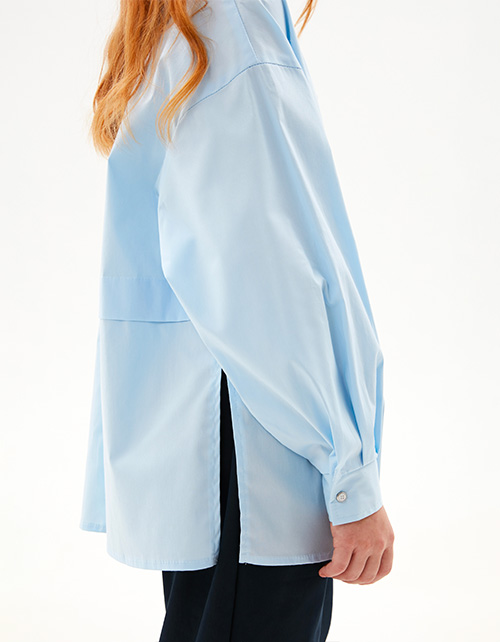 Элегантная светло-голубая блузка прямого силуэта, с утончённой лаконичной вышивкой. Комфортная застёжка на кнопки. Накладной карман. Глубокий разрез с одной стороны. Складки-защипы на рукавах. Модель выполнена из качественного поплина для комфорта и стиля.