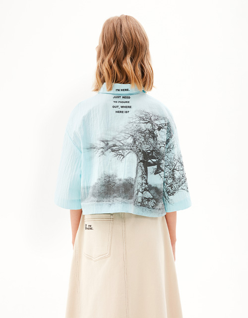 Кроп-рубашка освежающего водного оттенка для девочки. Прямая укороченная модель. Спущенная линия плеча. Комфортная застёжка на кнопки. Рубашка из поплина с эффектом "жатости", придаёт оригинальный внешний вид и не требует глажки. Авторский принт.