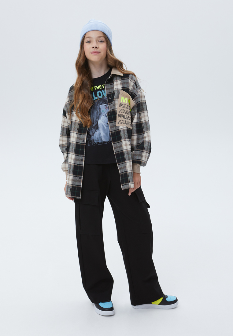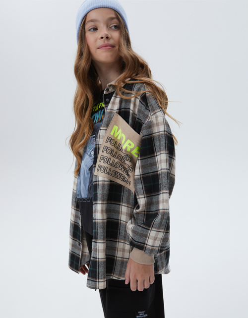 Трендовая рубашка в клетку для девочки. Модель оверсайз со спущенной линией плеча. Изделие на удобных кнопках. Манжеты из рибаны. Интересная комбинация материалов. Оригинально декорированный контрастный карман.