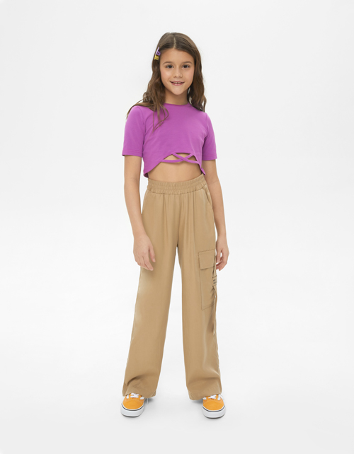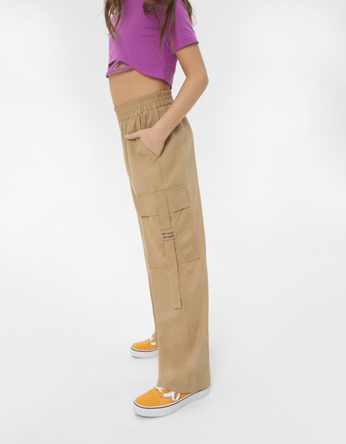 Модные бежевые брюки карго для девочки. Широкая модель со средней посадкой. Изделие из лёгкого и мягкого лиоцелла.