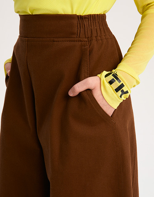 Брюки из твила коричневого оттенка для девочки. Прямая объёмная модель (багги), со средней посадкой. Изделие на мягком эластичном поясе с возможностью регулировки по объёму. Изделие дополнено боковыми карманами. Вариант стилизации: можно подвернуть.