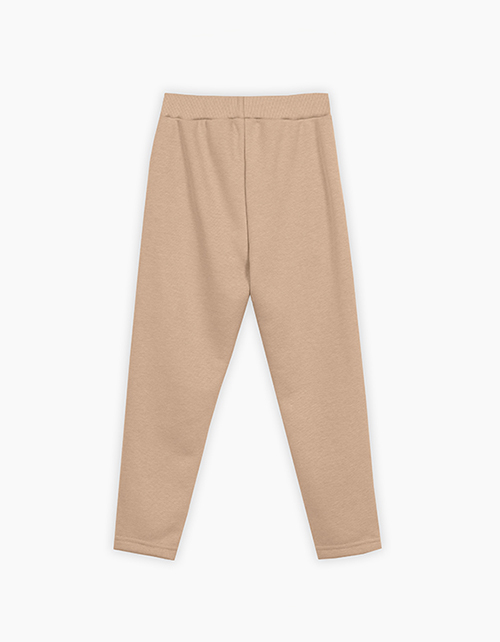 Стильные прямые брюки в тёплом бежевом оттенке для девочки. Зауженная модель со стрелками. Изделие на комфортном мягком поясе. Брюки из комбинации эко-кожи и футера.