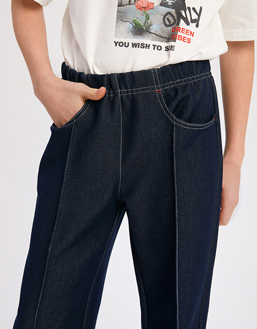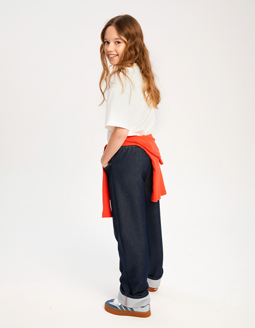 Брюки оттенка деним для девочки. Прямая широкая модель, со средней посадкой. Изделие на мягкой эластичной ленте. Манжеты с отворотами из основной ткани. Брюки дополнены боковыми карманами. Изделие декорировано красными отделочными строчками.