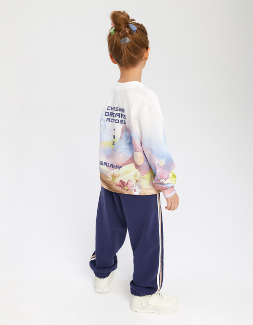 Брюки-джоггеры трендового оттенка Future Dusk для девочки. Комфортная прямая объёмная модель со средней посадкой. Изделие на мягком поясе. Эластичные манжеты на резинке. Брюки дополнены карманами в швах. Изделие декорировано лампасами по бокам.