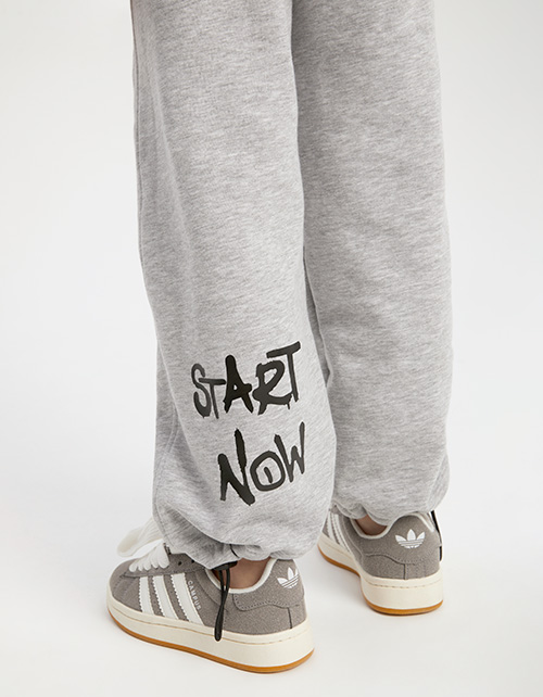 Брюки оттенка серый-меланж для девочки. Комфортная прямая модель со средней посадкой. Изделие на эластичном поясе. Низ изделия с утяжкой. Брюки дополнены карманами в швах. Изделие декорировано авторским шрифтовым принтом.