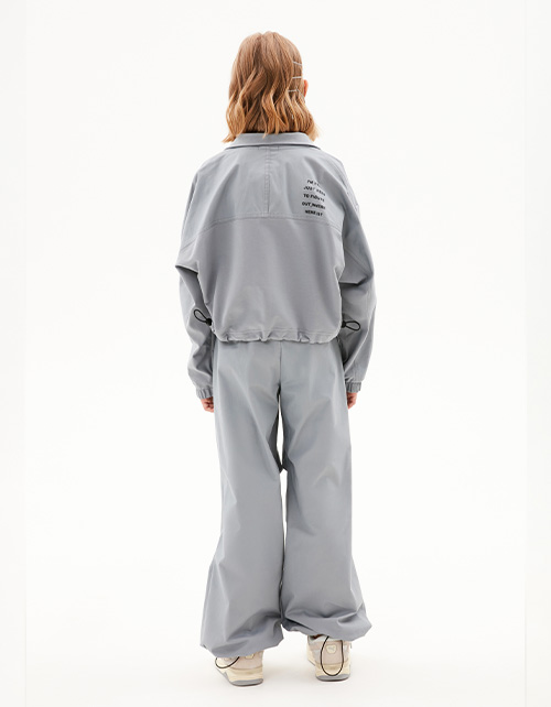 Брюки-парашюты из твила серо-зелёного оттенка для девочки. Широкая модель со средней посадкой, на мягком эластичном поясе. Регулируемая утяжка-резинка с фиксатором снизу штанины позволяет корректировать длину, модель и форму. Брюки дополнены карманами.