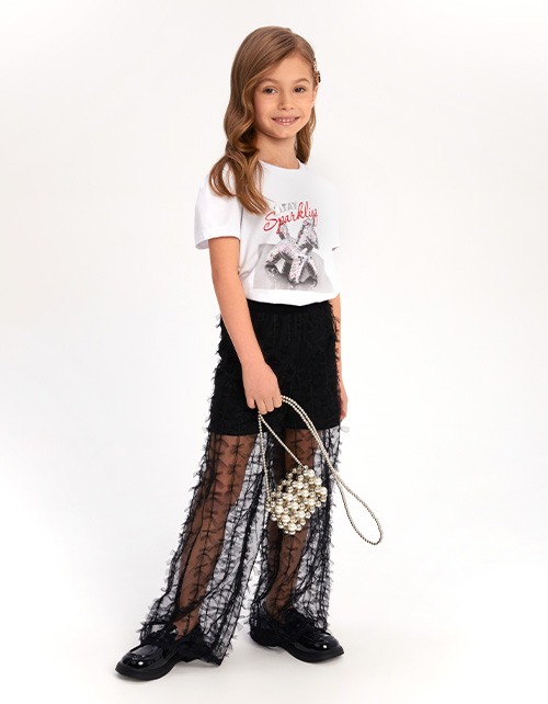 Дизайнерские чёрные брюки для девочки. Прямая широкая модель со средней посадкой. Пояс выполнен из бархатной эластичной ленты. Комбинация из кулирной глади и сетчатого полотна. Сетчатый материал с бантиками.