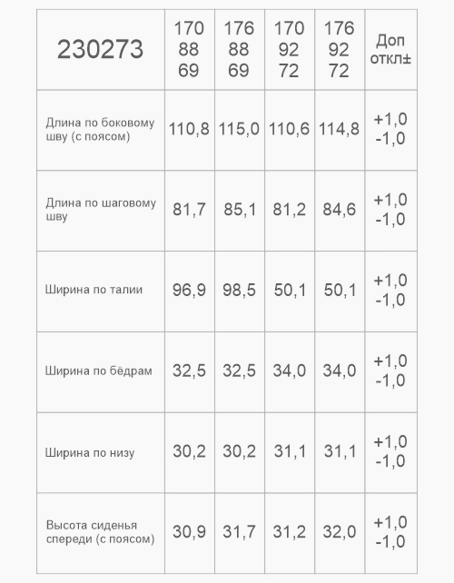 | Обхват бёдер, см | 61 | 65,8 | 65,8 | 71,6 | 71,6 | 76,6 | 80,7 | 80,7 | 82,8 | 87,6 | 92,4 | 92,4 | 94 | 94 | 98 | 98 |