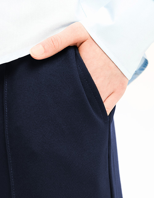 Широкие тёмно-синие школьные брюки для девочки. Модель из трикотажного полотна. Изделие со средней посадкой, на мягком поясе с регулировкой. Карманы в боковых швах. Брюки с защипами спереди.