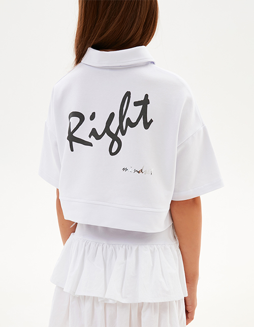 Белый джемпер-поло для девочки. Комфортная прямая укороченная модель. Спущенная линия плеча. Застёжка поло на кнопки. Изделие в стиле спорт-шик декорировано авторскими принтами и перьями.