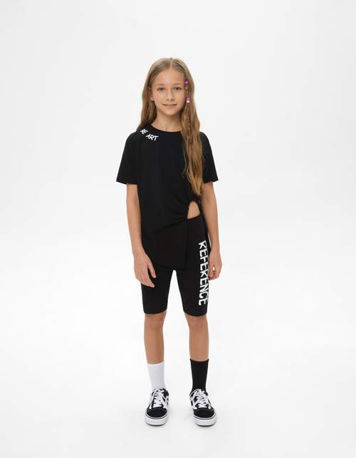 Черная футболка для девочки. Модель полуприлегающего силуэта со спущенной линией плеча. Изделие из кулирной глади декорировано трансферной плёнкой. Удлинённая футболка с ассиметричным низом.