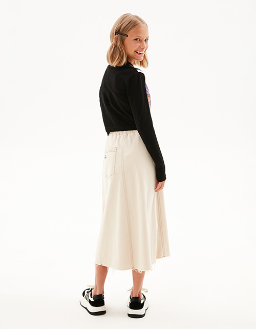 Стильный чёрный лонгслив для девочки. Укороченная модель прилегающего силуэта. Эластичная горловина. Лонгслив декорирован авторским принтом, 3d эффект которого создаётся за счёт комбинации кулирной глади и сетчатого материала.
