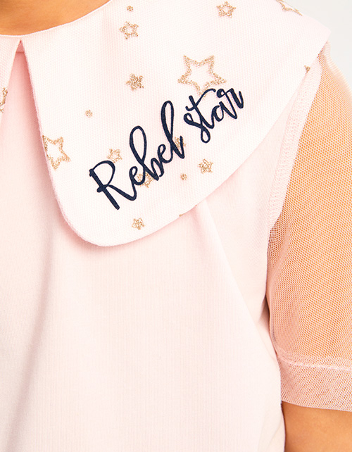 Футболка для девочки. Модель прямого силуэта, короткий прозрачный сетчатый рукав. Крупный воротник декорирован бархатной плёнкой. Мягкий материал, комфортная посадка. Застёжка по спинке. Идеальна для стильных образов и фотосессий.