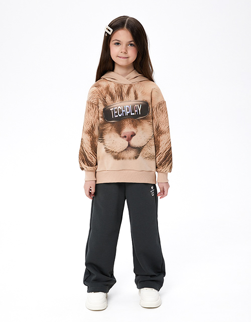 Худи тёплого бежевого оттенка для девочки. Модель прямого объёмного силуэта с глубоким капюшоном. Спущенная линия плеча. Манжеты и низ изделия из эластичной рибаны. Худи декорировано стильным авторским принтом.