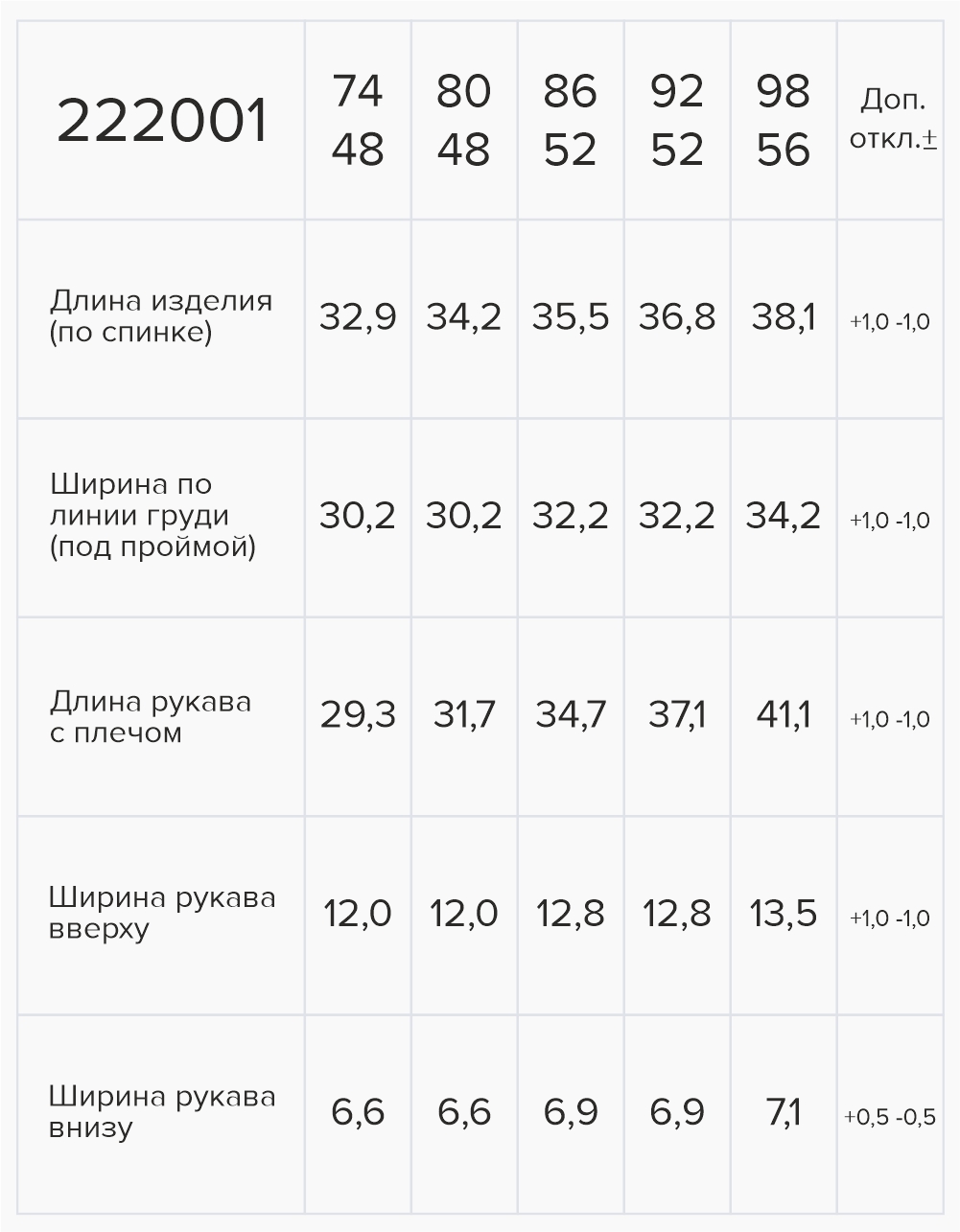 | Рост, см | 56 | 62 | 68 | 74 | 80 | 86 | 92 | 98 |