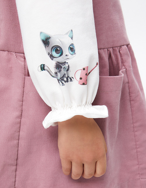 Романтичный лонгслив оттенка молоко для девочки. Модель прямого силуэта. Воротник-стойка из рибаны. Рукав заканчивается нежной сборкой на тонкую эластичную ленту. Лонгслив дополнен авторскими лаконичными принтами.