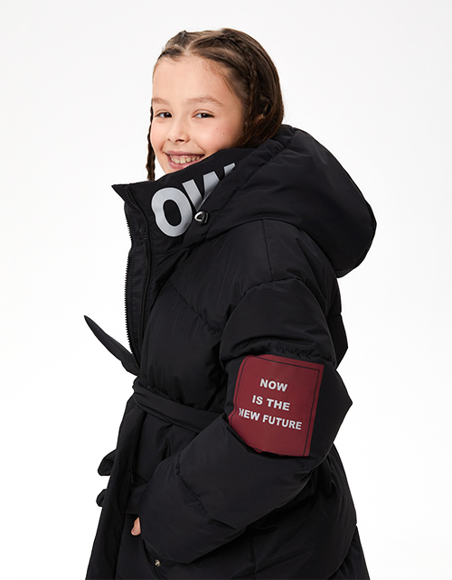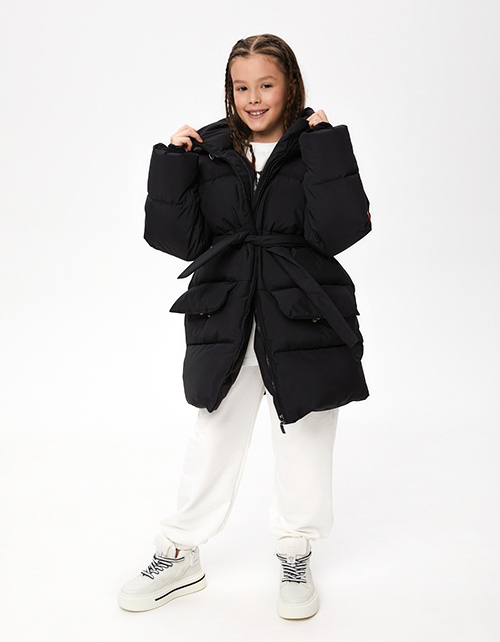 Чёрная плащёвая матовая ткань. Прямая модель со съёмным поясом из плащевой ткани. Вместительные карманы с клапаном. Воротник-стойка и глубокий капюшон. Дышащая нейлоновая подкладка. Авторский декор. Гипоаллергенный синтепух. Рекомендовано до -20.