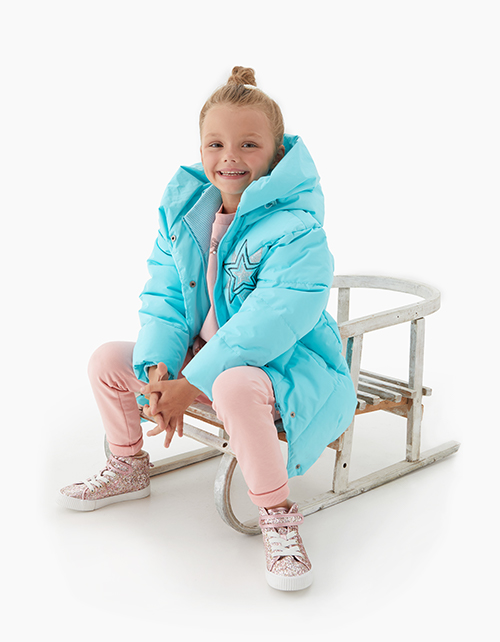 Легкая и удобная куртка для девочки прямого силуэта на синтепухе дополнена принтом в виде звезд и капюшоном с высоким воротником. Ткань плащевая матовая дьюспо не пропускает влагу и легко поддается чистке.