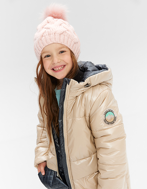 Светло-бежевая зимняя куртка для девочки. Модель с акцентным элементом в виде отстегивающейся сумочки и накладными карманами. Куртка выполнена из функциональной и простой в уходе ткани с модной фактурой "эко-кожи".