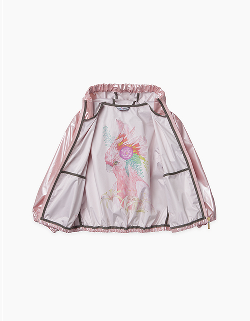 Стильная светло-розовая ветровка с капюшоном для девочки. Из плащевой ткани с перламутром, с застежкой-молнией и двумя боковыми карманами. Авторский акварельный принт в стиле капсулы "Райские птицы" на внутренней стороне