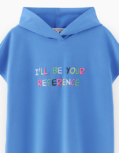 Лазурное платье-сарафан. Модель прямого силуэта со спущенной линией плеча. Изделие из футера с браш-эффектом декорировано объёмной разноцветной вышивкой. Платье стильно смотрится в паре с лонгсливом или футболкой из коллекции.