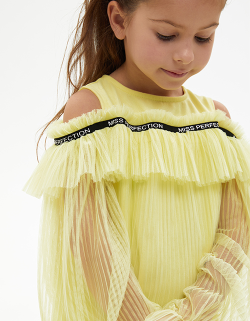 Весеннее платье солнечного оттенка. Модель с открытыми плечами и объёмными летящими рукавами с декоративной рюшей снизу. Комфортный А-образный силуэт. Застёжка на пуговицу. Платье из сетки плиссе и с комфортной хлопковой подкладкой. Декоративная лента.