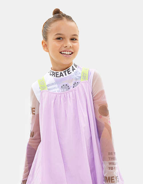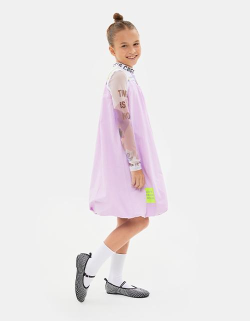 Платье-баллон оттенка цифровая лаванда на подкладке из тонкой хлопчатобумажной ткани. Широкие контрастные бретели. Модель из лёгкого поплина с эффектом жатости. Для сохранения фактуры материала, глаженье запрещено. Платье декорировано авторской печатью.