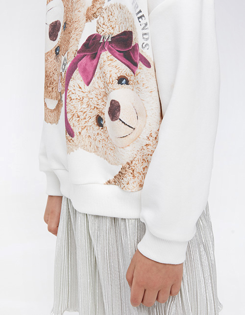 Милое платье для девочки. Модель прямого силуэта. Имитация комплекта из свитшота из футера и плиссированной юбки. Воротник, манжеты и низ свитшота из эластичной рибаны. Платье декорировано авторским принтом и стразами.
