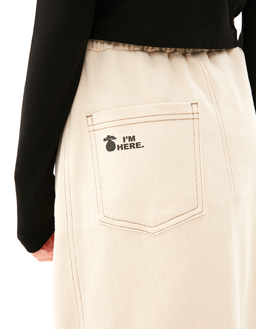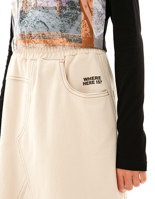 Юбка миди из твила базового оттенка экрю для девочки. Модель комфортного А-образного силуэта. Средняя посадка, на мягком эластичном поясе из футера. Юбка дополнена спереди боковым, а сзади накладным карманами. Лаконичный авторский шрифтовой принт.