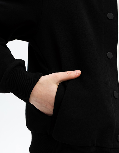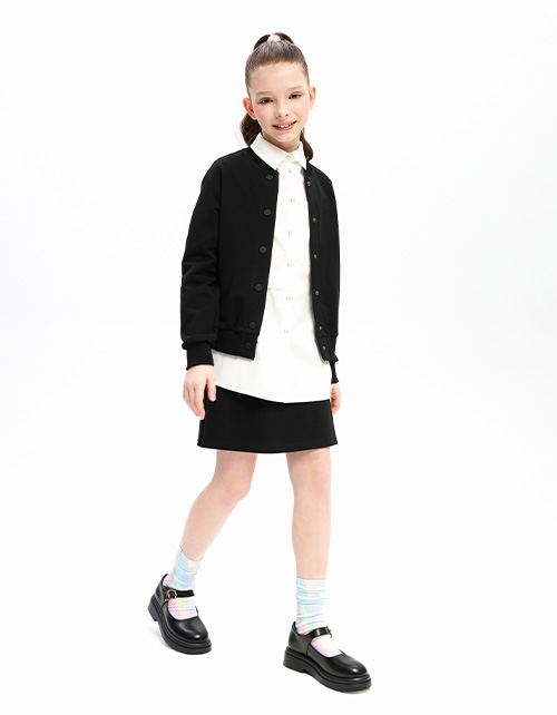 Стильный чёрный жакет-бомбер для девочки. Воротник-стойка, манжеты и низ изделия из мягкой эластичной рибаны. Жакет дополнен карманами в швах. Комфортная застёжка на кнопках.