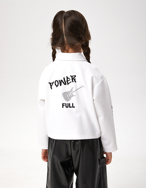 Дизайнерский брутальный жакет-косуха молочного оттенка для девочки. Модель прямого силуэта, с отложным воротником. Застёжка на молнию. Жакет декорирован рукотворной плёнкой и вышивками, авторскими шрифтовыми печатями.