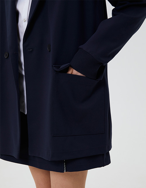 Тёмно-синий школьный жакет для девочки. Комфортная удлинённая модель прямого силуэта. Изделие с застёжкой на пуговицы. Верхний воротник и манжеты из мягкой рибаны. Накладные карманы.