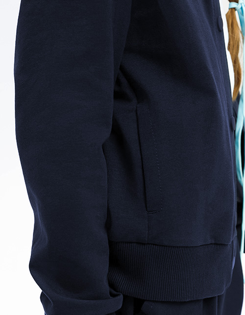 Стильный тёмно-синий жакет-бомбер для девочки. Воротник-стойка, манжеты и низ изделия из мягкой эластичной рибаны. Жакет дополнен карманами в швах. Комфортная застёжка на кнопках.