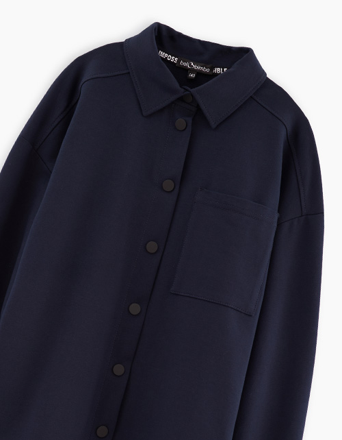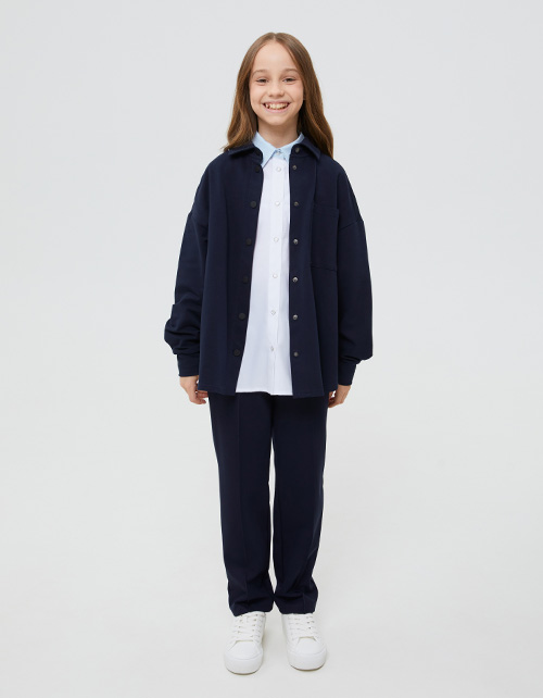 Тёмно-синий школьный жакет-рубашка для девочки. Модель прямого силуэта, оверсайз. Спущенная линия плеча. Накладной карман. Комфортная застёжка на кнопки. Манжеты из рибаны, на одном - деликатный авторский принт.