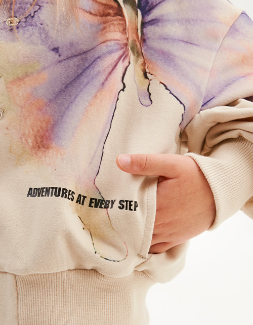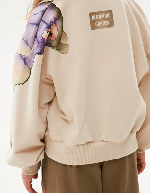 Укороченный жакет-бомбер оттенка экрю. Прямая свободная модель со спущенной линией плеча. Воротник-стойка, манжеты и низ изделия из эластичной рибаны. Застёжка на кнопки. Жакет из футера с бархатистым эффектом декорирован авторскими принтами.