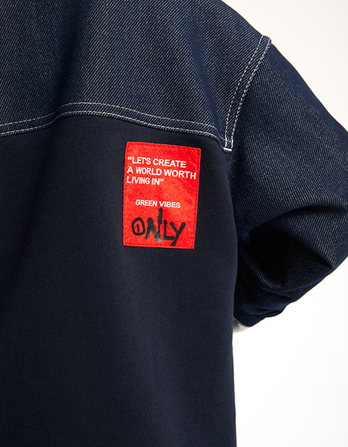 Стильный жакет оттенка деним. Прямая модель. Отложной воротник с отделкой. Приспущенная линия плеча. Отвороты по низу рукава. Комбинация футера и ткани под джинс. Жакет с застёжкой на кнопки дополнен накладными карманами. Авторская нашивка-лейба.