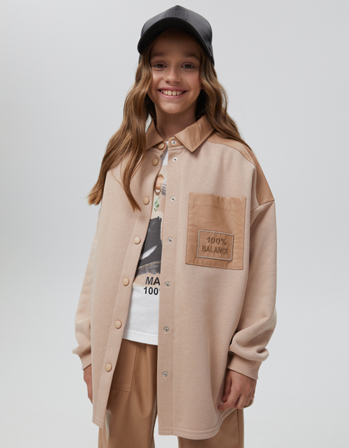 Бежевый жакет-рубашка для девочки. Модель прямого силуэта со спущенной линией плеча. Изделие на кнопках, с отложным воротником. Жакет из комбинации футера и эко-кожи. Спинка изделия декорирована авторским принтом, накладной карман - вышивкой с аппликацией