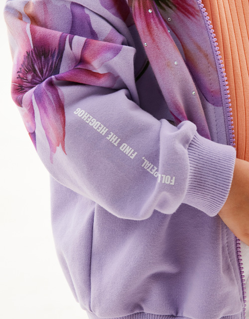 Зип-худи приятного оттенка лаванда для девочки. Прямая модель. Контрастный глубокий капюшон. Спущенная линия плеча. Эластичные манжеты и низ изделия из рибаны. Худи из тактильно приятного материала декорировано авторскими принтами и радужными стразами.