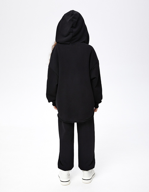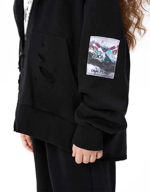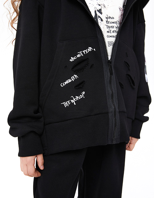 Чёрное зип худи. Прямая объёмная модель. Спущенная линия плеча. Манжеты, низ изделия спереди из эластичной рибаны. Удлинённая спинка с сырым срезом. Карман-кенгуру с декоративными разрезами. Застёжка на молнию, переходящую на капюшон. Авторская DTF-печать