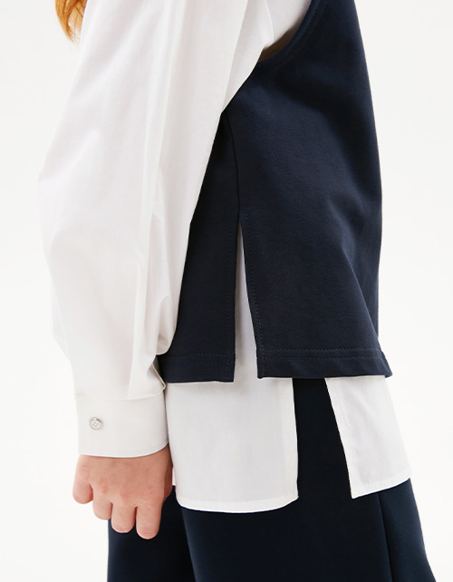 Стильный тёмно-синий жилет для девочки. Модель прямого силуэта. Глубокие проймы и разрезы по бокам помогают создать гармоничный и современный образ. Комфортное изделие из футера станет отличной базой гардероба школьницы.