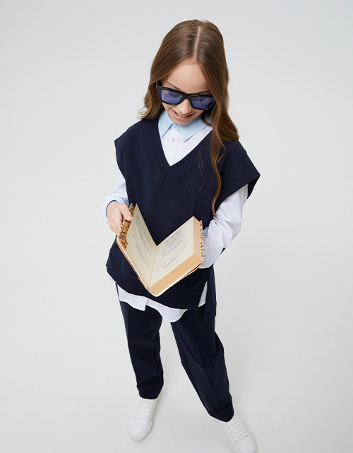 Тёмно-синий школьный жилет для девочки. Модель прямого силуэта. Удлинённая спинка. Спущенная линия плеча. V-образный вырез горловины. Деликатный авторский принт на спинке.