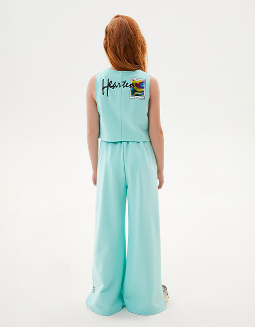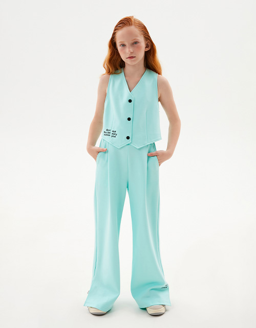 Стильная жилетка в освежающем оттенке морской бриз для девочки. Прямая модель. V-образная горловина. Комфортная застёжка на кнопки. Лаконичный шрифтовой принт спереди и акцентный на спинке, инновационная устойчивая DTF-печать.