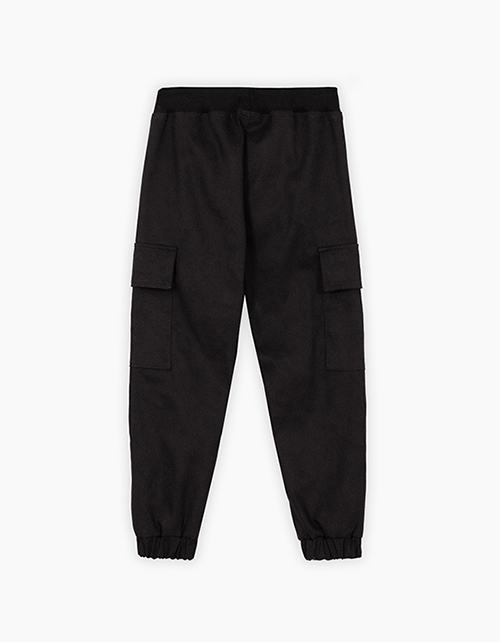 Модные чёрные брюки-карго для мальчика. Модель со средней посадкой на мягком поясе и резинкой по низу. Изделие из тактильно приятного твила. Брюки с боковыми накладными объёмными карманами с репсовой лентой.