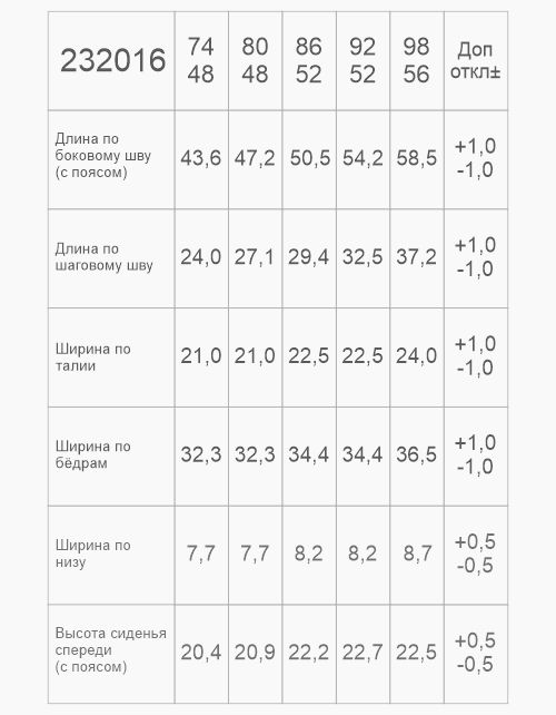 | Обхват бёдер, см | 61 | 65,8 | 65,8 | 71,6 | 71,6 | 76,6 | 80,7 | 80,7 | 82,8 | 87,6 | 92,4 | 92,4 | 94 | 94 | 98 | 98 |