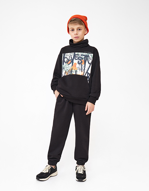 Комфортные чёрные брюки-джоггеры для мальчика. Прямая модель со средней посадкой. Изделие без застёжки, на мягком поясе. Брюки с карманами. Контрастный шрифтовой авторский декор сзади.