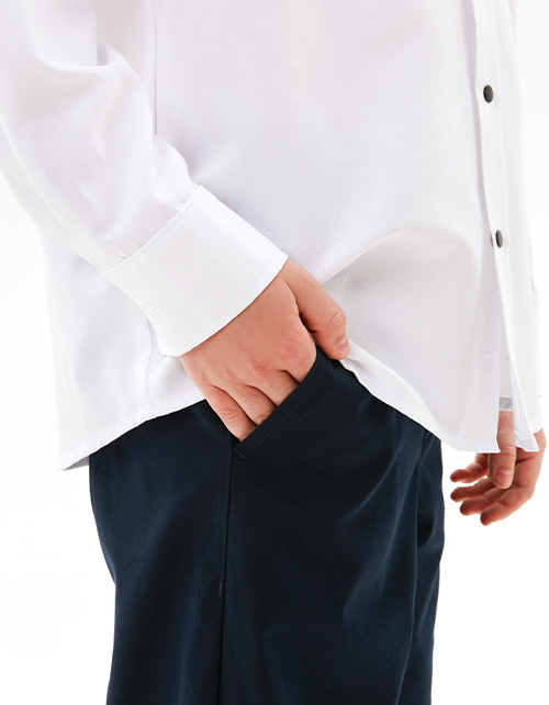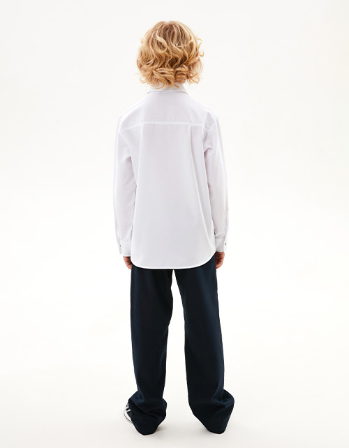 Тёмно-синие брюки из твила. Модель прямого силуэта и средней посадкой. Пояс с внутренней регулировкой. Есть шлёвки для ремня. Застёжка на молнию и пуговицу. Внутри карманы из 100% хлопка. Для улучшения характеристик, твил прошёл дополнительную обработку.