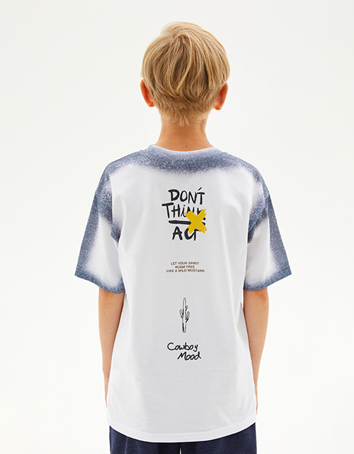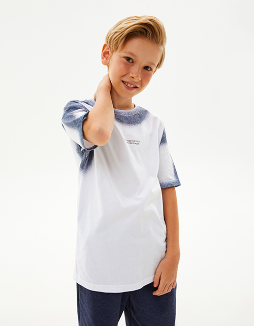 Дизайнерская белая футболка для мальчика. Прямая модель. Спущенная линия плеча. Эластичная горловина. Футболка с оригинальным авторским принтом.