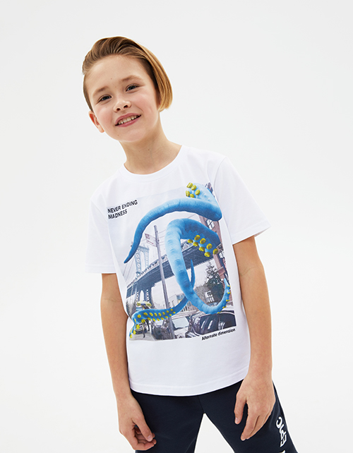 Дизайнерская белая футболка для мальчика. Модель прямого силуэта. Слегка спущенная линия плеча. Эластичная горловина из рибаны. Футболка декорирована авторским принтом.
