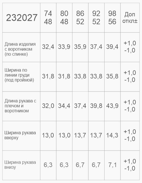 | Рост, см | 56 | 62 | 68 | 74 | 80 | 86 | 92 | 98 |