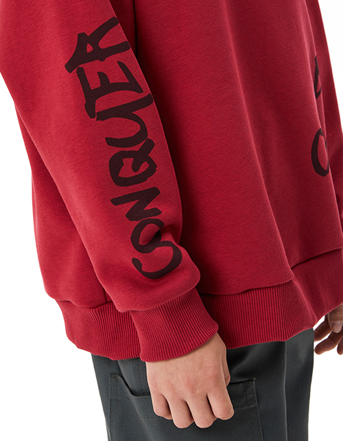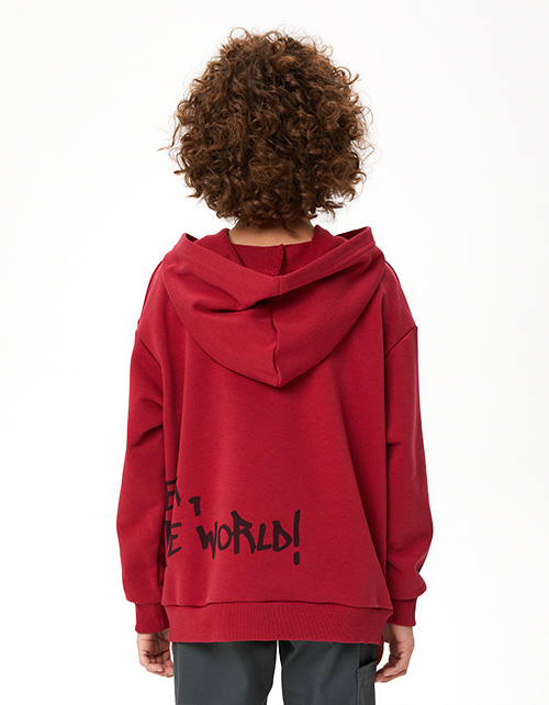 Худи благородного оттенка гранатовый сок для мальчика. Модель прямого силуэта с глубоким капюшоном. Спущенная линия плеча. Манжеты и низ изделия из эластичной рибаны. Худи декорировано авторскими DTF печатями, экосольвентной шрифтовой в стиле граффити.